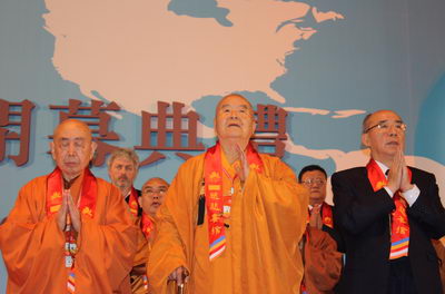 法会开始时,现场气氛庄严,三百位法师诵念《千华台上》、《六时吉祥》、《文殊心咒》,缓缓步入会场,诵念《启告十方》。会场中为本次大会主题“和、谐”两个大字,及大会标志莲花图样。
