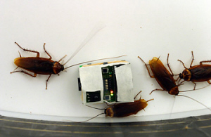 研究人员通过程序控制,让机器蟑螂也具有蟑螂的特点:喜欢躲藏到阴暗的遮蔽处和喜欢扎堆儿。在12只蟑螂中放进4只机器蟑螂,这个群体的表现和正常的蟑螂群体一样,让它们在一暗一亮两个遮蔽处挑选,大多数时候它们都会躲到暗的遮蔽处去。
