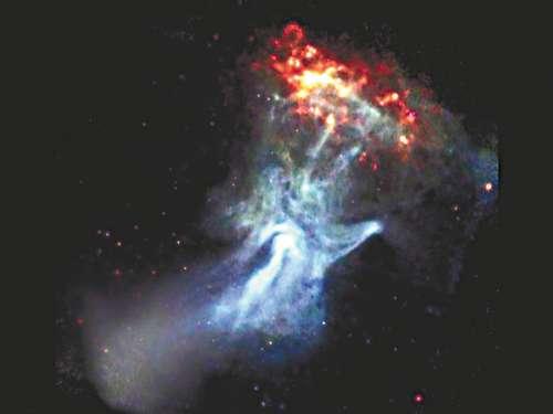 脉冲星喷出数量庞大的电磁能量,创造了一团由尘和气形成的云,这团云长达150光年。照片中那红色圆碟,是另一团气云。据信,手指是能量从脉冲星传至气云时形成的。美国太空总署的科学家估计,图片中的景象,实际上是发生在一万七千年前。它被X光拍下后,以每小时6亿英里的速度传至地球。