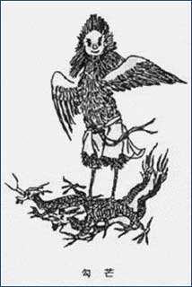 句芒的形象若何?据材料,春神句芒的原始形象,是鸟身人面。《山海经·海外东经》说:“东方句芒,鸟身人面,乘两龙。”句芒之鸟身人面,说明居住在东方的大白皋部族,原本是一个以鸟为图腾信仰的部族,而句芒神也许就是该部族的图腾神。春神句芒是女性,抑或男性?没有材料可以说明。但神话中的大白皋部族,已经是个男权部族社会了。还有材料说,句芒神的脸是四方形的。后世的句芒图,因受神话历史化和男权社会的影响,除了头顶上还保留着一些被称为“芒”的毛发而外,几乎完全变成了一个古代朝臣的形象。
