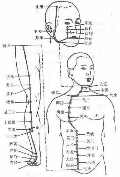 承泣 四白 巨髎 地仓 大迎 颊车 下关 头维 人迎 水突 气舍 缺盆 气户 库房 屋翳 膺窗 乳中 乳根 不容 承满 梁门 关门 太乙 滑肉门 天枢 外陵 大巨 水道 归来 气冲 髀关 伏兔 阴市 梁丘 犊鼻 足三里 上巨虚 条口 下巨虚 丰隆 解溪 冲阳 陷谷 内庭 厉兑