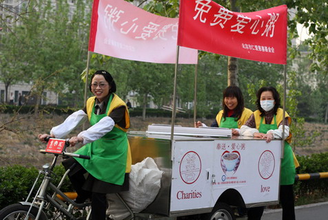 喝粥的人——满脸皱纹的老人,穿戴讲究的年轻人,头戴工作帽、身穿工作服的民工,几乎所有的人盛到粥后都感激地说声“谢谢!”。刚开始的时候,人们排队喝粥的表情与到商店排队买限售便宜商品一样,漠然而急切,而现在,人们恬然安静,仿佛在用心体验享受这个阳光灿烂的春天的清晨......
