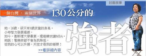 她,是台大教授柯承恩的女儿,26岁,只有8岁孩童的身高,小时智力发展迟缓,如今,韦斯利大学毕业,还继续攻读MBA。她说:电梯按钮不会为我降低,但我的心可以升扬。天空才是我的极限!
