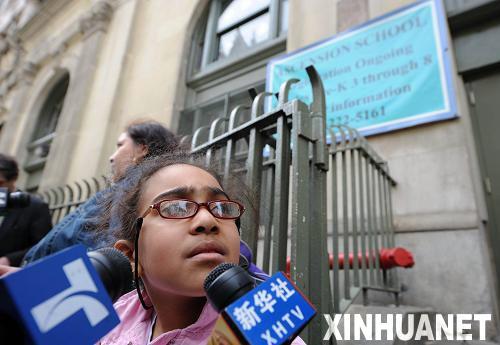 4月29日,在美国纽约曼哈顿阿松森学校门口,准备跟随家长回家的该校学生查妮尔接受记者采访。到4月29日为止,阿松森学校有7人出现疑似猪流感症状,目前均已回家休息治疗。有关医学检测正在进行中。新华社记者谷欣容摄