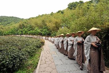 杭州寺庙众多,素有“东南佛国”之称。佛诞日上午,来自灵隐寺、净慈寺、上天竺、中天竺、下天竺、永福寺、韬光寺、灵顺寺、径山寺及杭州佛学院的200多位僧人,在手持锡杖的长老的带领下,头戴斗笠,身披衲衣,以手持钵,低眉敛目,从上天竺法喜讲寺出发,沿西湖边的上香古道托钵行脚至灵隐寺,并在此举行佛教仪轨及慈善捐赠仪式。