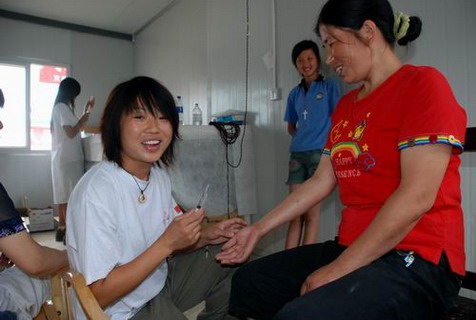 一年的时间即将过去了,他们中的一些志愿者却依然留在这里,董明珠就是其中一位。4月17日,记者在四川省安县桑枣镇辽园板房小区一间板房的医护室里遇到了她,董明珠正忙着帮助大夫为灾区儿童检查身体。