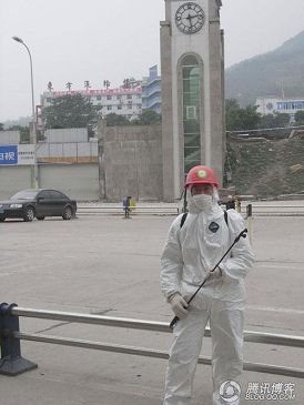 被分配到的主要工作是给遇难者遗体以及给救援人员消毒。战士们一旦挖出遗体,他就背着喷雾器,在废墟上给遗体喷洒环境消毒液,然后再挖出来,避免遗体上的病菌传染。还要给遗体洒石灰,再把遗体放到装尸袋里运送,以避免传染病。战士们作业完,还要用生物试剂对他们做全面的消毒,保证战士们的安全。一切都是为了防止灾后瘟疫发生。