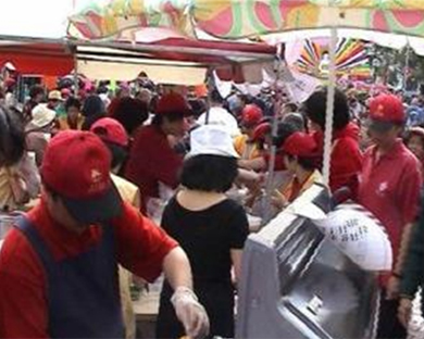 十点起,信众自由浴佛和义卖园游会正式展开,共有二三十个摊位义卖各式各样的素食小吃、日常用品,并有义诊为大众服务。此次园游会可以说是难得的素食盛会,如素羹、素糕、点心、酸辣汤、串烧、烤玉米、各类豆腐制品等等,让人垂涎三尺,食指大动。这次的素食大汇聚也让大开眼界,因为很多食物不论是外形上或是口感上都不像是素菜,打破固有的青菜萝卜简陋形象。
