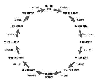 经脉作为经络系统的主要部分,共有两类:一类是十二正经,另一类是奇经八脉。十二正经是气血运行一周的必经路径。十二正经依据各经所联系的脏腑的阴阳属性以及各经在肢体循行位置的不同,分为手三阴经、手三阳经、足三阴经和足三阳经。按照阴阳学说,四肢内侧面为阴,外侧面为阳;脏为阴,腑为阳。所以行于上肢外侧面联属腑的为手三阳经,行于上肢内侧面联属脏的为手三阴经。下肢亦如此。三阴经又依据阴气盛衰来分,阴气最盛为太阴,其次为少阴,再次为厥阴;三阳经按照阳气盛衰排列为:阳明最盛,其次为太阳,再次为少阳。按照上述原则,十二正经分别为:手太阴肺经、手少阴心经、手厥阴心包经、手阳明大肠经、手太阳小肠经、手少阳三焦经;足太阴脾经、足少阴肾经、足厥阴肝经、足阳明胃经、足太阳膀胱经、足少阳胆经。十二正经在体内运行是循环贯注的,即从手太阴肺经开始,依次传至足厥阴肝经,再传回手太阴肺经,首尾相贯,如环无端。(见下图:十二经脉流注次序)