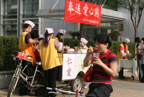 外出奉粥的志愿者们正像蚂蚁一样忙碌地出出进进仁爱心栈,他们手里或者拿着勺子,或者拿着苕,或者抬着粥桶,或者撑开插在粥车上的标语,各人忙着各人的工作。