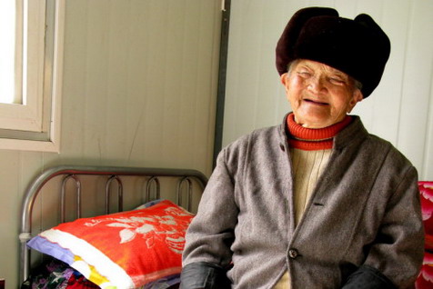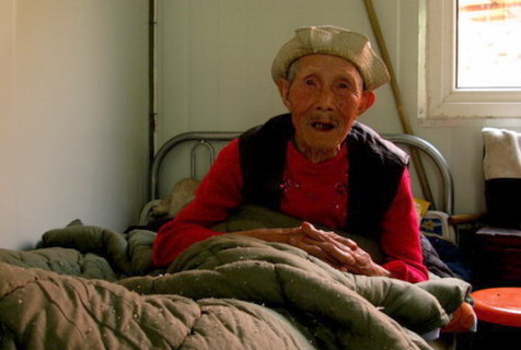 这位高龄老人的耳朵有些背,但思维还很清楚,她说:“我是真正的贫、穷、孤、寡,都占全了。地震以后我只有睡在地上,日子很难过,到这里来了好多了,吃的、喝的、睡的都不愁了。就是没有钱,想买点东西都不行。”