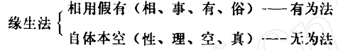 至此,我想把以上的论点做一个小结:缘生法,相用假有,在佛书浓缩为相、有、为俗,即有为法;自体本空,在佛传浓缩为性、为理、为空、为真,即无为法。如下表: