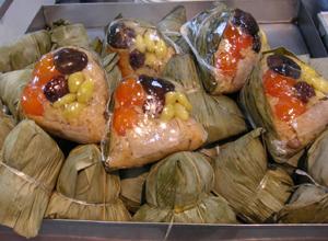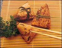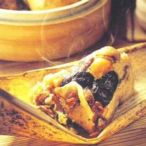 此外,还有一种叫豆腐粽子。做这豆腐粽子,可不能够用嫩豆腐,一定要买老一点的豆腐当原料。包裹起来有点像做豆沙粽子那样,先把老豆腐切成长条形状,拌好调料;而后要把粽子做成枕头那样的,先放一些糯米进去,再放进一条老豆腐,然后再用糯米盖实了扎起来,一个豆腐粽子就包裹好了。豆腐粽子端上桌子时,由于在煮的时候所用时间比较久,豆腐里面的水分都蒸发掉了,夹在糯米粽子一起的豆腐吃起来就显得硬邦邦的,味道也是不错的。