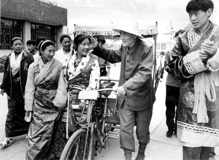 白芳礼老人生前与受到他资助的天津市红光中学藏族学生在一起(1994年摄)