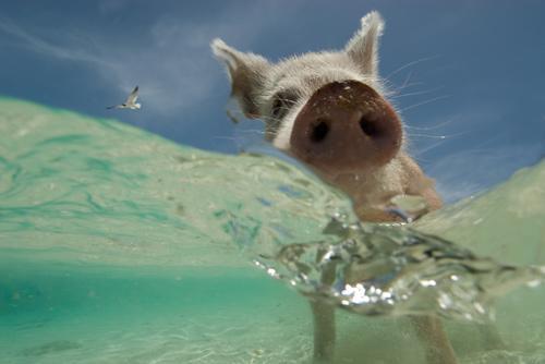埃克斯马岛附近有座相对偏僻的小岛,这里有一群特殊的“居民”——猪,依靠游客留下的残羹冷炙存活。它们似乎充满好奇心,见到过往游船,常常游过去探个究竟。这张照片由尼尔·哈默尔施拉克(Neil Hammerschlag)拍摄,获得学生组第一名。