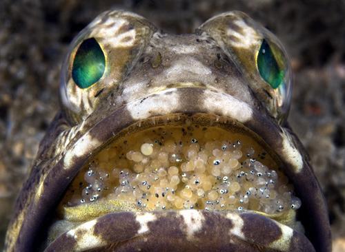 这条颚鱼嘴里含着一窝窝的卵,直至它们孵化。颚鱼经常在海底活动,寻找沙子、岩石和珊瑚残骸等。这张照片是由史蒂文·科瓦塞斯(Steven Kovacs)拍摄的,获鱼类或海洋动物组第一名