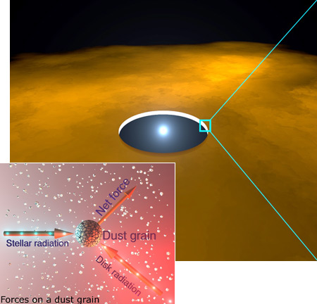 在第二篇文章中,克罗地亚斯普利特大学的物理学家Dejan Vinkovic研制出了一个模型,展现了恒星风与来自原行星盘内部的红外线辐射是如何结合在一起,从而将极其微小的硅酸盐结晶从原行星盘的内部区域吹到几十亿公里之外的更寒冷的外部区域,而那里正是彗星以及其他寒冷的岩石天体——例如冥王星——形成的地方。