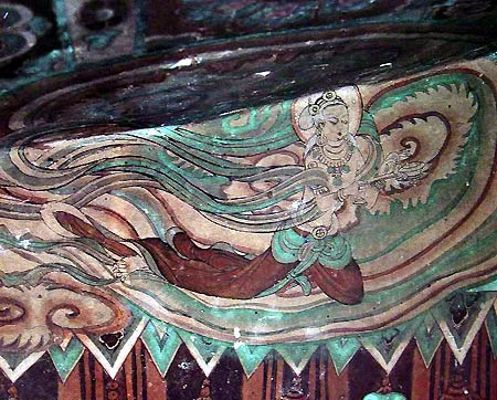 体现唐代佛教艺术灿烂辉煌的是敦煌莫高窟壁画和龙门石窟。唐代莫高窟壁画佛像数量最多,保存最完整,内容最丰富精彩,造像总体精神面貌已呈中国式。从题材内容上,隋以前的本生故事大大减少,代之而起的是大量经变故事(经变故事是中国对佛教的一大创举,具有鲜明的民族性) 。唐代壁画完全是一片经变的海洋,各种经变故事均能在此找到,反映了唐代净土宗的盛行。如《药师经变》《净土经变》《维摩经变》等等,尤其是维摩经变一改“示病”之形象,表现出来的是一位张目须眉,目光炯炯,身体强硕,健康智慧的老者形象,表现出唐代昂扬勃发、奋进豪迈的时代精神。菩萨的形象也更具人情味、世俗化, “菩萨如宫娃”的情况为我们在莫高窟唐代壁画中所见菩萨形象相合。这些菩萨曲眉丰肌,秾丽多姿,亲切温和,充分体现了唐代女性美的特点。供养人的形象也大量出现,他们完全是按照当时的审美标准创造出来,男的褒衣博带,雍容不凡,女的 丽华贵,气态悠闲,完全是张萱、周 笔下的仕女形象,只是服饰不同罢了。在壁画其间穿插着众多的飞天乐伎,洋溢着欢乐、轻松、热烈的气氛。总之唐代的壁画欢乐明亮的气氛代替了阴森忧郁的情调,喜乐升平的极乐世界代替了阴森血腥的场面,呈现出一个欢乐祥和的盛世气象。无论是经变故事、菩萨、还是供养人,他们都与现实生活有着密切的联系,凭着对佛教的理解,对审美及生活的认识,凭借着非凡的创造力和高超的表现技能,中国唐代的艺术家们完成了外来艺术中国化、宗教艺术世俗化的转变,从而创造出中国式的佛教艺术。
