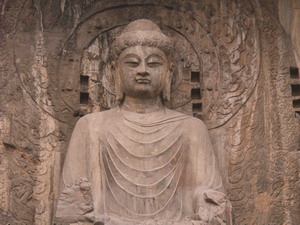 最具大唐风采的是于672 年营建由武则天助脂粉钱二万贯的龙门石窟奉先寺中的卢舍那大佛座像。佛像高大雄伟,完全是在以写实的手法为基础又不违背佛教仪轨(三十二相,八十种好)的原则下创造而成。大佛整体精神特征也趋向中国式, 面容庄严典雅,脸型丰满圆润,眉如新月,鼻梁直挺,面部表情温和慈祥,把大唐盛世对外来文化兼容的恢宏气度、大唐民族开朗健康的性格和高度民族自信心的风貌表现得淋漓尽致。大佛周围的阿难、菩萨、天王、力士等神态各异,栩栩如生,他们之间性格特征不同,但又相互关联,构成一组完满的群雕。唐代的佛教艺术在形象塑造与内在精神的结合上,宗教性与世间性,理想性与表现性方面已达到完美的境地,可谓“灿烂求备”。