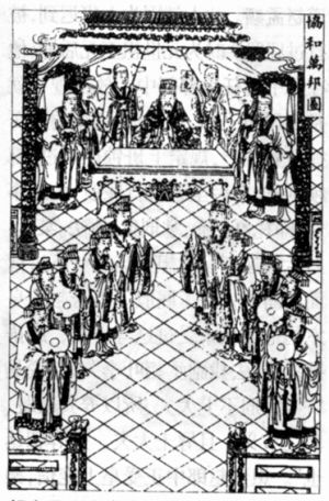 《万历野获编》卷十三记,明神宗时,因朝会时开时辍,“班行遂无定序”。有一次,一个阁部官员和一个监察官员互争位次,请编制朝班的蔡献臣分辨是非,老蔡谁也不想得罪,便引成例:如按常朝,你是对的;如按大朝,他亦不错。由此可见,各种朝会有不同的位次安排,这是在中央机关供职的官员必须掌握的一门学问,否则一上班就要出错。