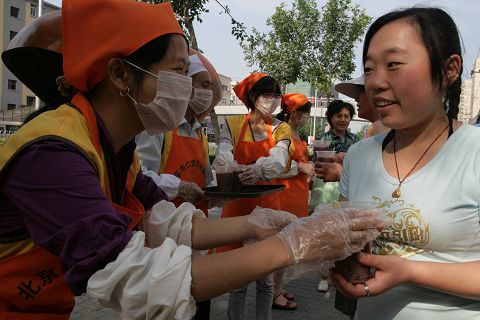 因为我们是第一次奉粥,对奉粥“制服”的穿法还有些不熟,便互相帮忙穿衣,在并不熟练的相互扶助中,不时迸出的笑声中,我们平日在网络上的文字交流一下子就变得亲近生动起来。全副武装之后,大家都被捂得严严实实,统一的装束让大家立时升起同在一个团体的归属感。