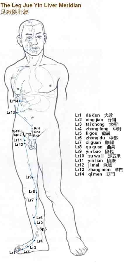 肝经起于足大趾的上部,并沿着脚的上部,再经过内踝(内脚眼),一直向上循行于下腿及大腿的内侧,直至股部内侧。再绕过阴部,进入小腹,并在腹部向上走,在胸胁部与肝及胆连接。经络继续上行,并沿着喉咙,与眼部联系,后出于前额,直达头之巅顶。肝经其中一个支脉从眼部向内走,下行至面颊部,并在唇的内部环绕行走。另一支脉则从肝开始,通过横膈膜,向上流注于肺,最后与肺经相连接,并完成十二经脉的循环。