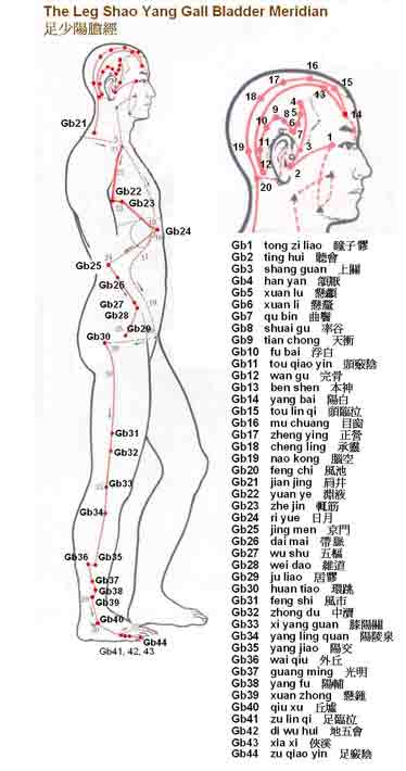8.至目锐后;9.其支者,别目锐;10.下大迎;11.合于手少阳抵手崸;12.下加颊车;13.下颈合缺盆;14.以下胸中贯膈;15.络肝;16.属胆;17.循胁里;18.出气街;19.绕毛际;20.横入髀厌中;21.其直者,从缺盆;22.下腋;23.循胸