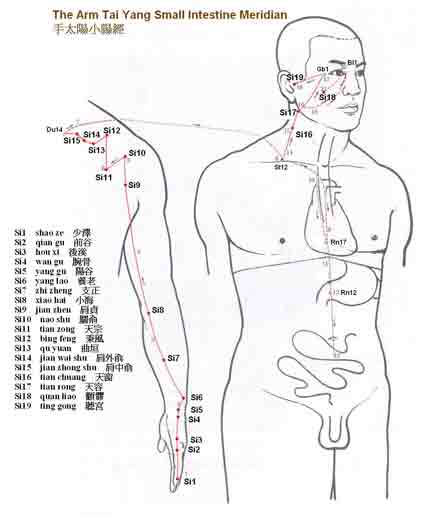 小肠经起于小指之端,通过手掌和手腕,沿着前臂外后侧上行,直至肩后及背脊骨最高处(颈项底部)。从此处分出一支脉进入体内,经过心及胃,直达小肠,与小肠相接。另一支脉则在体外循行于颈及颊之间,直达眼外角,再入耳,面颊部一短支脉进入眼内角,与膀胱经相连。
