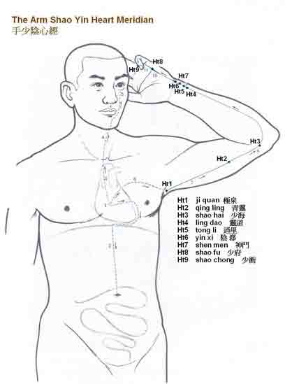 心经起于心,分为三条支脉。第一支脉走至小肠,第二支脉沿着喉咙走至眼部,第三支脉从臂下分出,并沿着上臂、手肘及前臂,通过手腕及手掌内侧,直至小手指尖内侧,与小肠经相接。