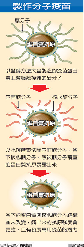 翁启惠强调,分子疫苗可以完全克服这些问题。研究团队找出流感病毒一段不会突变的抗原HA醣蛋白,这段被醣分子盖住的蛋白质序列不易发生突变,透过酵母大量培养,再水解酵素醣蛋白,将无用的醣分子切断,留下核心醣分子和蛋白质,即可制成“分子疫苗”,不需要病毒株,制作价格也较便宜。