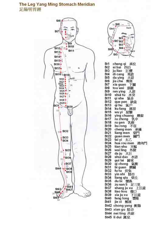 胃经起于鼻侧即大肠经的尽头,再经过眼内角,并从眼下部分出,一直往下走,进入上牙肉内,绕过唇及下颚,并向下走至胃,与胃相接,在体外,经脉经过颈,胸及腹,及至股沟,再往下循行于大腿及小腿前部,直至脚面,及至足二趾尖的侧部,另一支脉则从脚面分出,走至足大趾,与脾经相接。