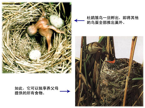 杜鹃鸟是先天不做窝的,但这却丝毫不影响它生儿育女、传宗接代。杜鹃鸟大如喜鹊,浑身灰黑,下的蛋却小过麻雀,跟柳莺的蛋差不多。当它要下蛋的时候,它就装成猛禽,在柳莺的窝边猛扑翅膀,发出可怕的声音,把柳莺惊起飞离鸟窝。然后杜鹃就把柳莺的蛋叼起一只丢到窝外边,或者吃掉,自己再下一只蛋到窝里。当柳莺惊恐地回到窝里之后,哪里还顾得上看窝里蛋的真假,更不知道它的儿女已被调包并惨遭毒手了。
