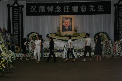 洁白的灵堂,高挽黑纱。由绿叶、黄白色菊花组成的“心”型簇拥着任老的遗像,照片中的任老满头华发,侧面凝眸,仿佛正在倾听,又仿佛正在思考。