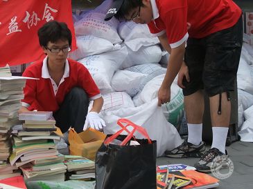 34号宿舍楼前正好有几棵壮硕的国槐,荫庇着树下色彩醒目简易凉棚间身着红色T恤衫的同学们。他们的面前赫然堆积着如小山般各类衣物,虽个个都埋头分拣衣物忙得顾不上停歇,但脸上却并无烦躁之意。这里是清华大学毕业生捐衣物献温暖的地点,宛如身上红衣般热心的青年们,来自一个叫做清华大学学生爱心公益协会的社团组织。