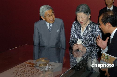 日本明仁天皇和皇后2005年8月曾参观在日本东京国立博物馆举办的《遣唐使和唐代美术展》。(中新社)