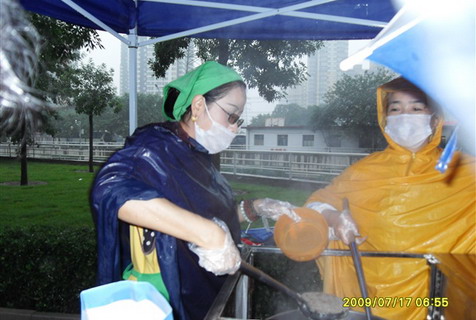 雨中奉粥的义工