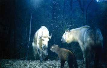这是四川的唐家河自然保护区,画面上的一家三口是金毛扭角羚,国家一级保护动物。红外线触发照相机记录了这个场面。那闪光灯的光亮似乎对她们丝毫没有影响。面对这个宁静的画面,我相信很多人会久久的沉默,用心去参详这大自然的神秘和安详,至少我是如此。在野外,即使我们万分幸运地遇到野生动物时,通常看到的是他们或惴惴不安,或惊恐万状,伴之以逃之夭夭。有几回能够见到她们如此悠然地徜徉在自已的家园?享受天伦之乐?