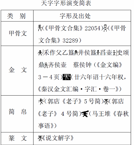 之形衍进。”王襄此说大体勾画了“天”字字形的演变方向,具有参考价值,但其论断则有继续讨论的余地。由笔者采集的“天”字字形来看(参看附表),“天”字形体在中国古代的发展演变并没有想象中那样清晰的轨迹,而是有一个反复渐进的过程,如甲骨文中已经有的“