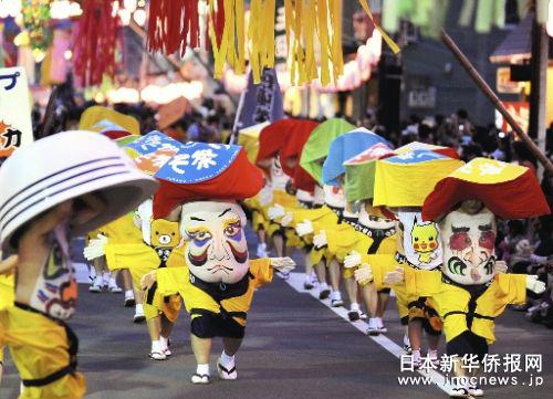 报道中称,时下正值北海道的旅游季节,大批游客争相为行进而来的“怪脸”们拍照留念。来自北海道名寄市、从事服装干洗业的古谷明哲一边兴奋地大笑着一边告诉记者:“看到这些怪怪的脸,就会记住这座城市,好像就收藏了这个城市的一张名片,精神头儿一下就上来了!”说着,他又回过头去,随着游行队伍脚下的节奏使劲鼓掌附和。