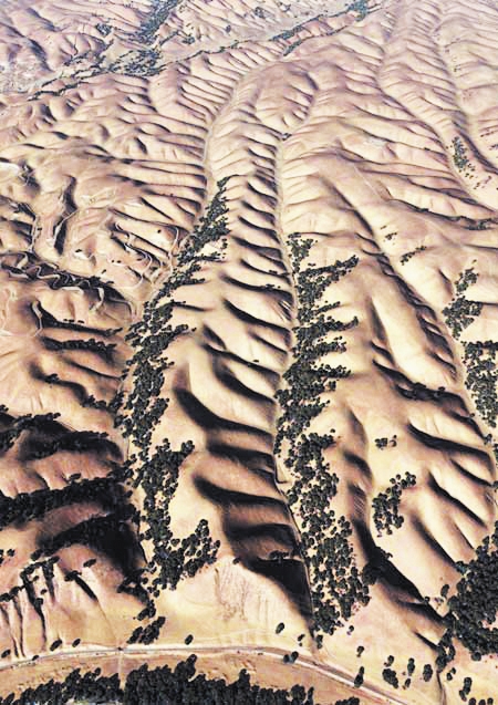 土壤蠕动和河流切割共同形成了一种常见的地形特征,图为美国加利福尼亚州Gabilan Mesa地区。