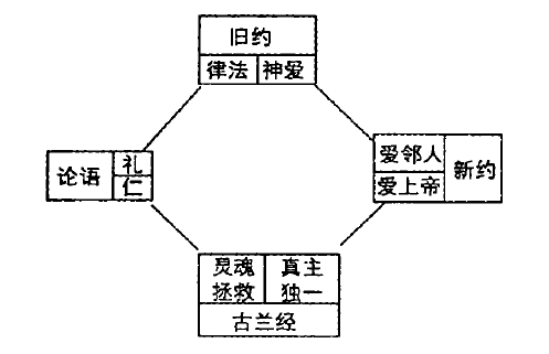 “神爱”与“爱邻人”的特有内涵中,发现了《论语》和《旧约》、《旧约》和《新约》之间的内在联系,又分别从“爱上帝”与“真主独一”、“灵魂拯救”与“仁”的特定意义中,发现了《新约》和《古兰经》、《古兰经》和《论语》之间的彼此沟通。正是在这种环环相扣的逻辑过渡之中,四种文本才得以成为一种有机构成的文化整体,才得以呈现出一种真正意义上的网状话语系统。以图示之: