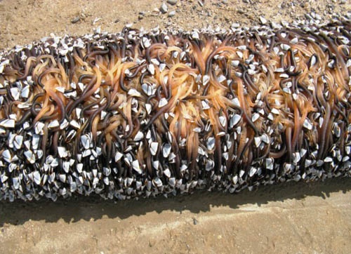 这个奇形怪状的“生物”出现在斯旺西附近的Oxwich海滩,它通体长约三英尺,外观像数以万计的章鱼似的皱皮黄褐色触角紧紧扭绞在一起,触角上还夹带着白色贝壳状生物,随着海浪诡异地翻滚。
