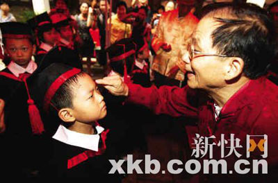 上午8时许,一年级小朋友在教师的引领下与家长列队步入学校操场。在老师的指引下,一年级新生双手举过头顶,依次整理自己的头发、衣领、纽扣、腰带和鞋带。这个“正衣冠”的仪式有一番来历,古人有云:“大抵为人,先要身体端整,自冠巾,衣服,鞋袜,皆须收拾爱护,常令洁净整齐。”整理衣冠后,孩子向父母深鞠躬表示感谢养育之恩。