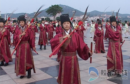 64名身着宋代宫廷服饰的表演者,在长岛海滨广场表演“八佾舞”。