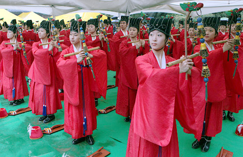 在韩国祭祀孔子的“释奠大祭”上,成均馆大学舞蹈系学生们正在进行“八佾舞”表演。