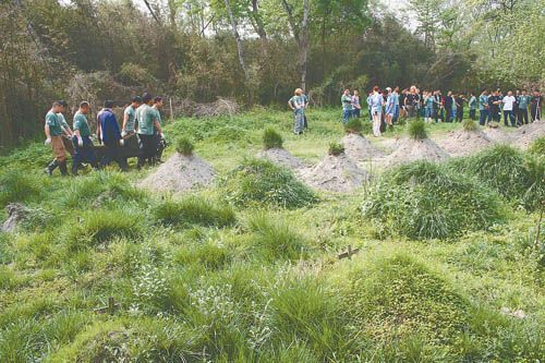 葬礼上,人们围着墓地,向死去的熊身上轻轻扔去三把泥土,有人念着悼词: