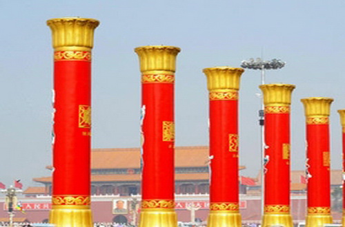 新中国60周年国庆大典天安门广场背景组字表演总策划人路建康介绍,这个创意寓意着56个民族平等、团结、和谐。柱头和柱子底座采用了人民大会堂东侧廊柱的式样,寓意着国家权力来自人民代表大会,56个民族共同建设民主政治、共同享有当家做主的权利。