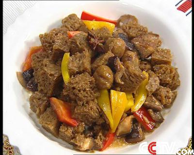 2、坐锅点火倒油,下八角、葱、姜、蒜爆香,加少许水、盐、白糖、酱油,烧开后放入烤麸、香菇、板栗翻炒均匀,勾少许芡,加香油、味精,放入青红椒炒匀出锅即可。
