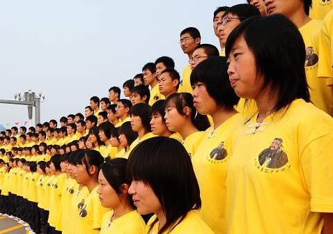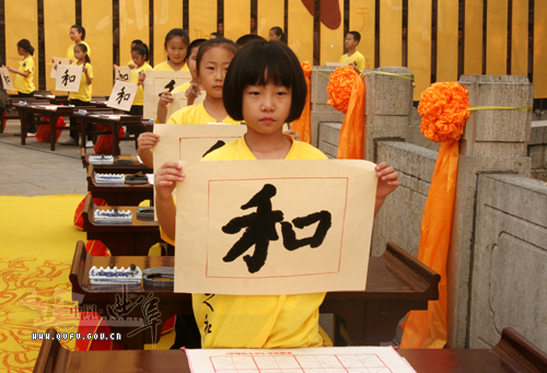 上午8时30分,由一万三千人组成的方队在神道两旁肃立迎接嘉宾,齐声吟诵“有朋自远方来,不亦乐乎”等《论语经典》。9时整,在曲阜的古城墙万仞宫墙前,乐舞阵阵,钟鼓齐鸣,几十名小朋友共同书写孔子的儒学精髓“和”。