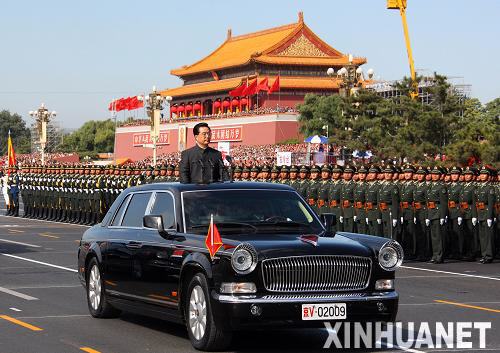10月1日,首都各界庆祝中华人民共和国成立60周年大会在北京天安门广场隆重举行。这是中共中央总书记、国家主席、中央军委主席胡锦涛检阅受阅部队。新华社记者王建民摄